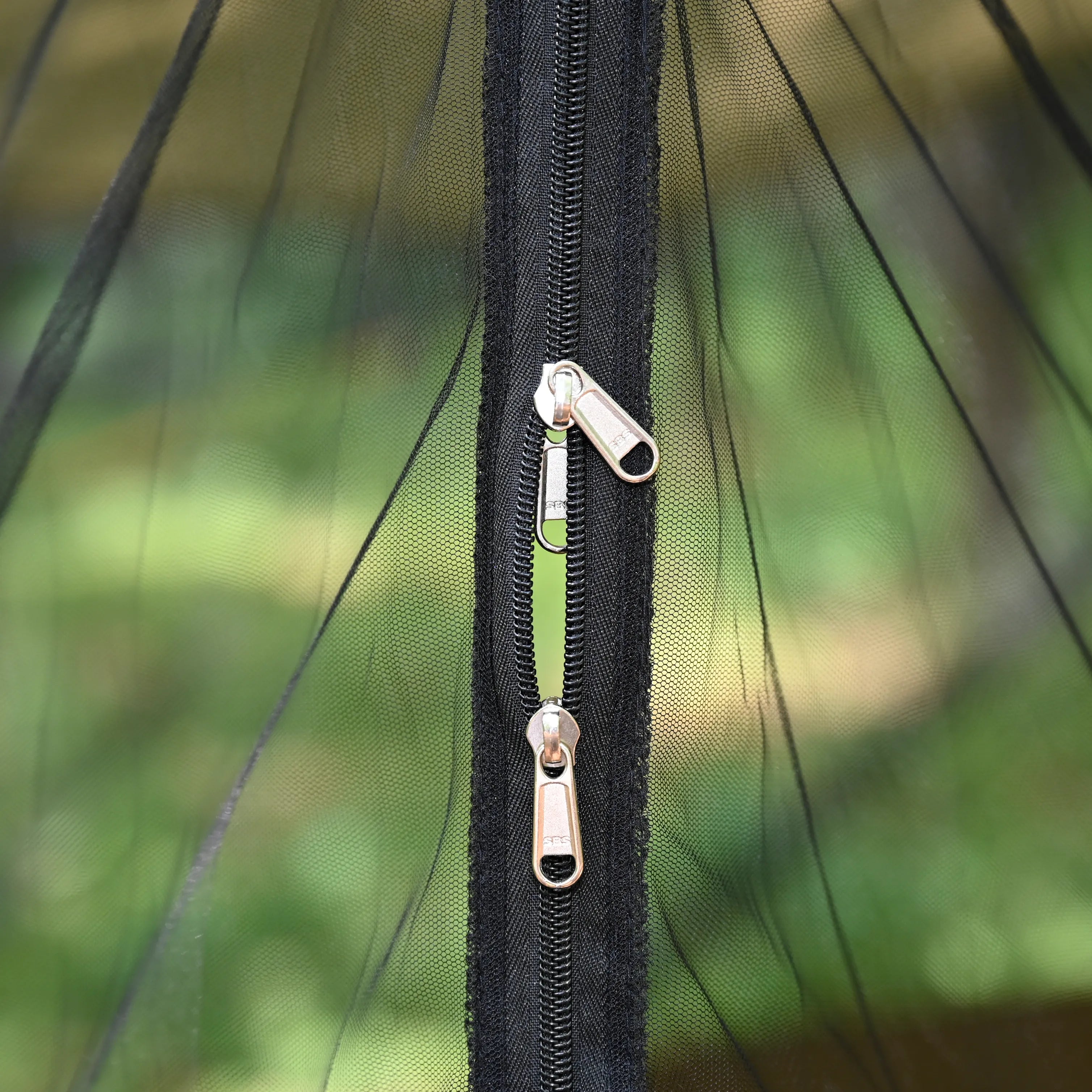 Doppelte vertikale Reißverschlüsse ermöglichen schnelles Ein- und Ausziehen von beiden Seiten. Sicherer Schutz gegen Insekten und gleichzeitig einfacher Zugriff auf Ausrüstung oder Gruppencamping.