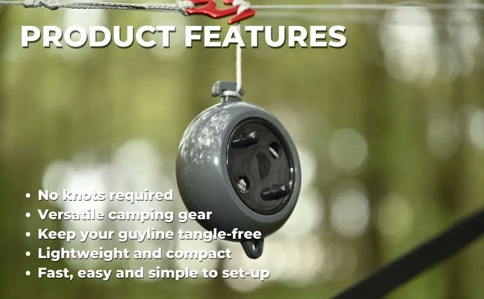 Mit dem drehbaren, geriffelten Nockenmechanismus können Sie die Abspannleine schnell aufwickeln und verwicklungsfrei verstauen – so bleibt Ihre Schnur ordentlich und ist für den nächsten Gebrauch bereit.