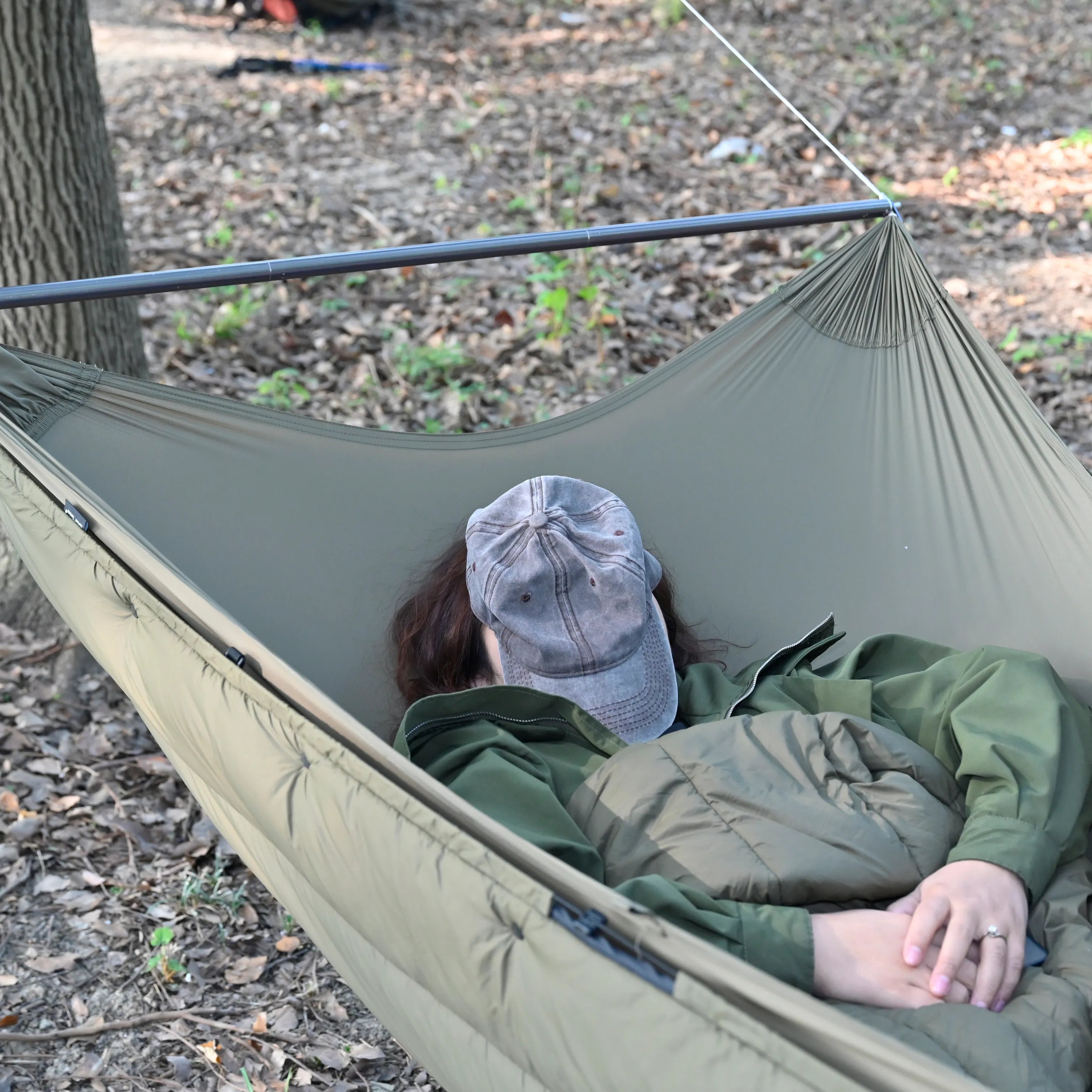 1.07m bar widens shoulder space + stabilizes the hammock. Switch between lounging and sleeping modes effortlessly.