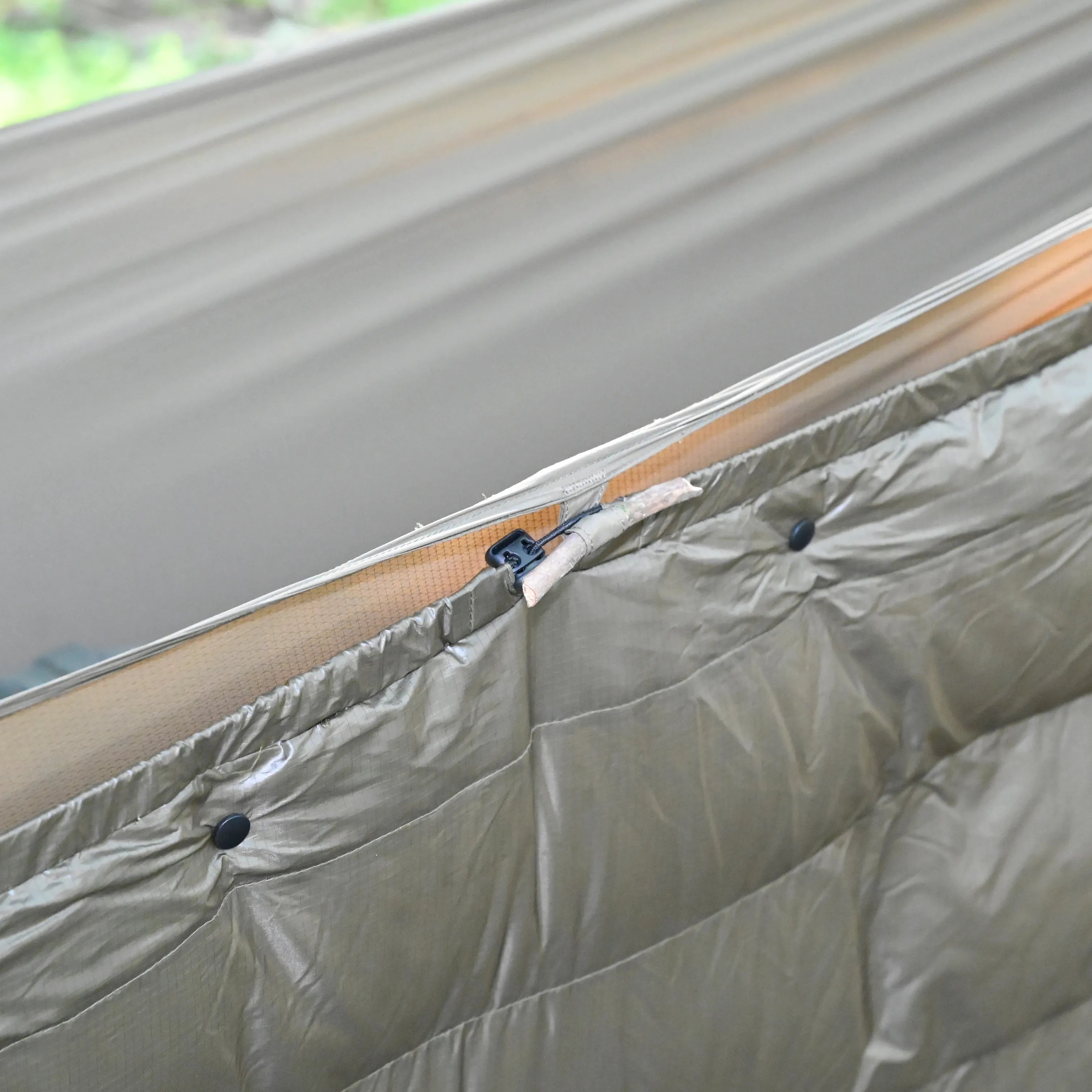 1.7oz silnylon balances lightweight durability (285g bed) + breathability. Hexagon weave resists tears and snags.
