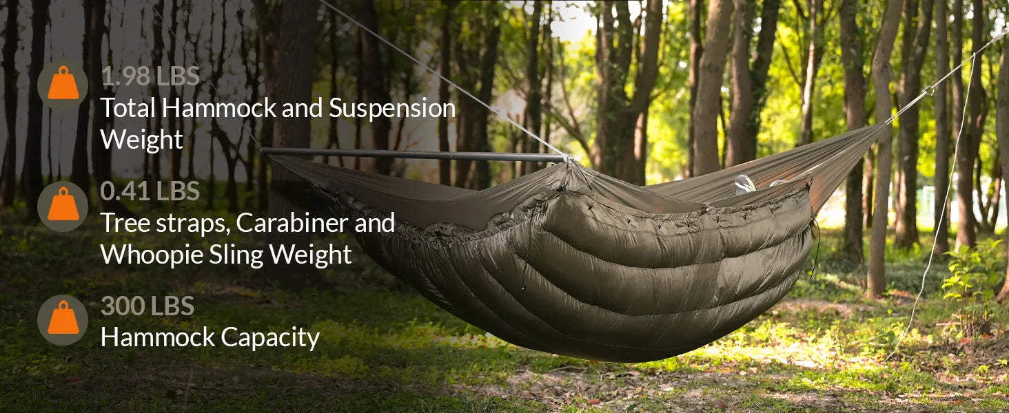 - Comes complete with ultralight tree straps, spreader bar, carabiners, whoopie slings, and more.