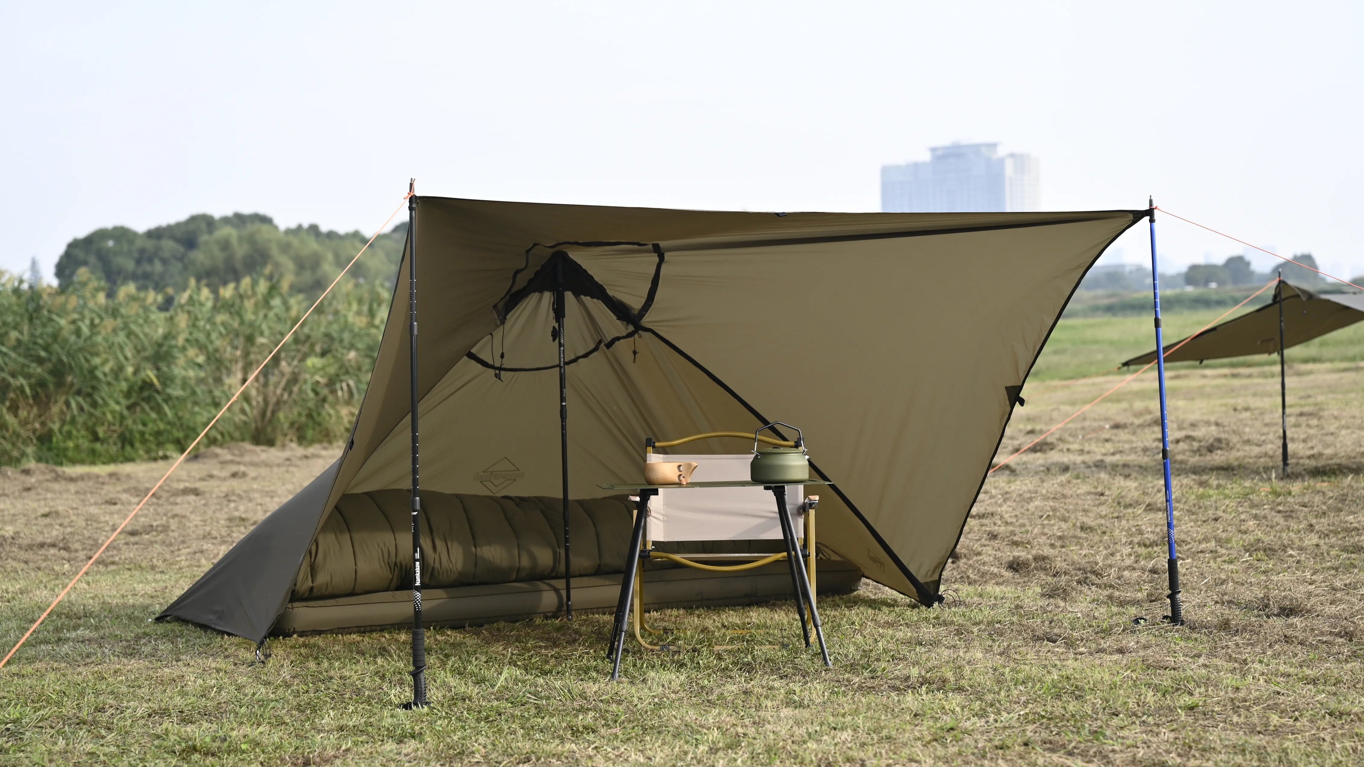 Set high for spacious lounging or low for storm coverage. 300g silnylon with 3000mm waterproofing. Pitch in 5 mins with trekking pole/stick.