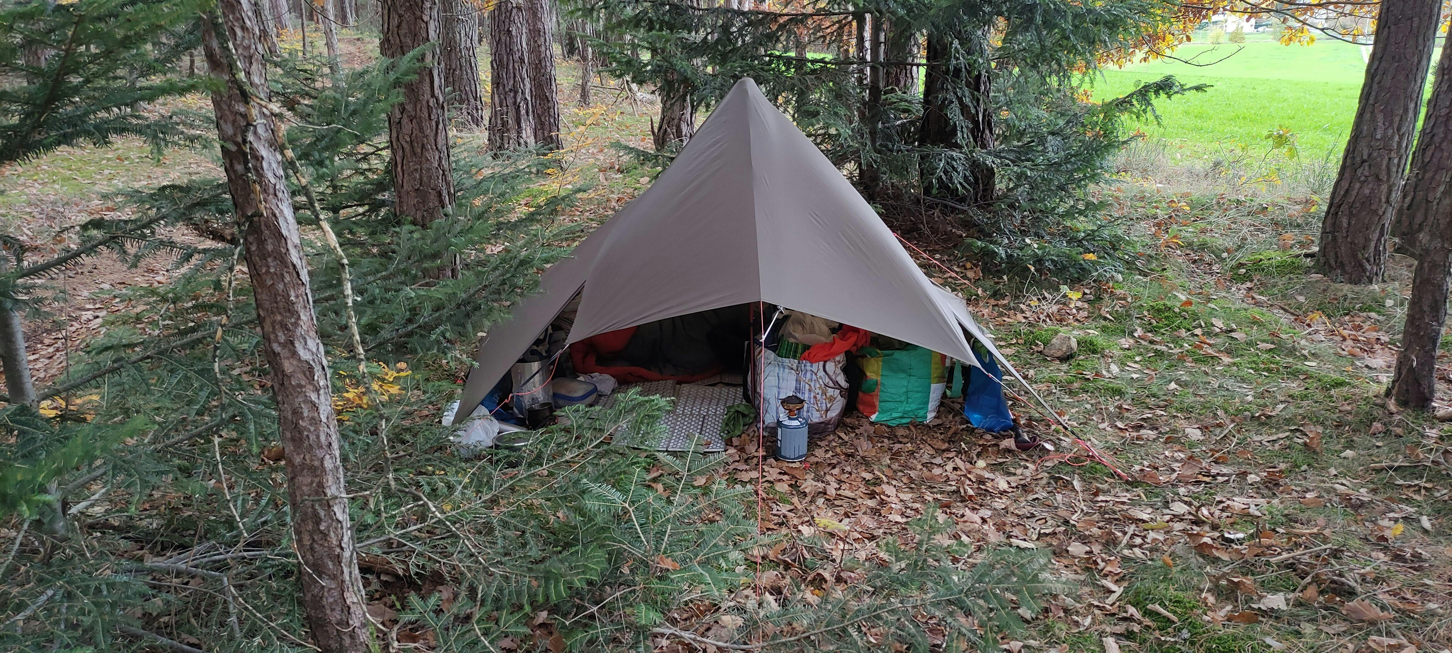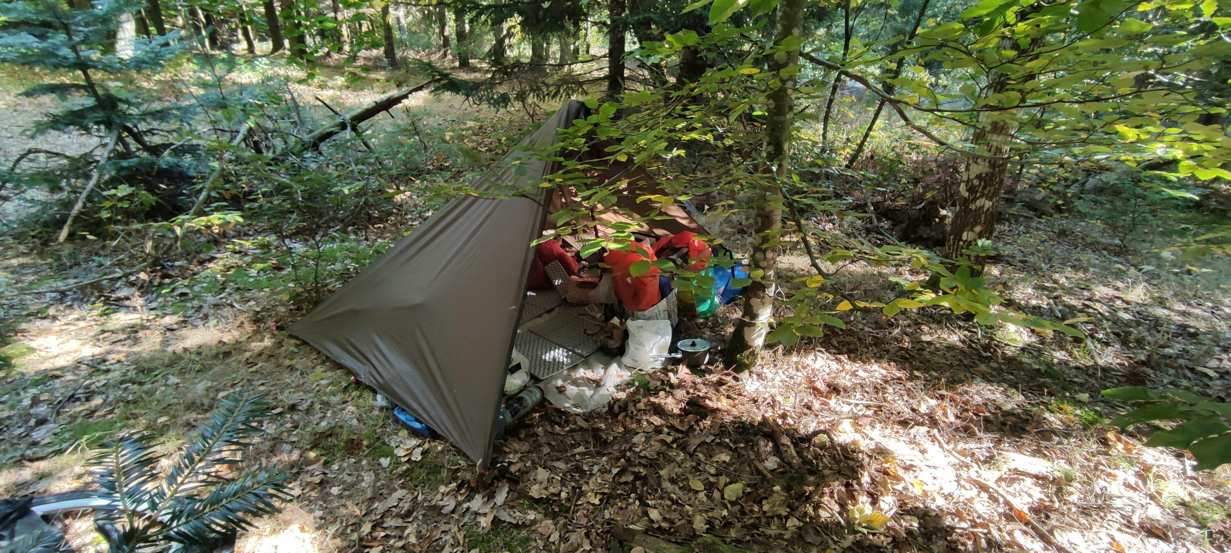 No tent poles? No problem! Use a stick, trekking pole, or tree to create a shelter half tent in minutes.