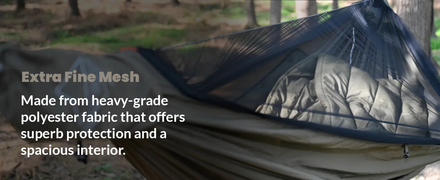 - This camping hammock with bug net features a full-length, 2-way zipper for quick access and total insect defense.