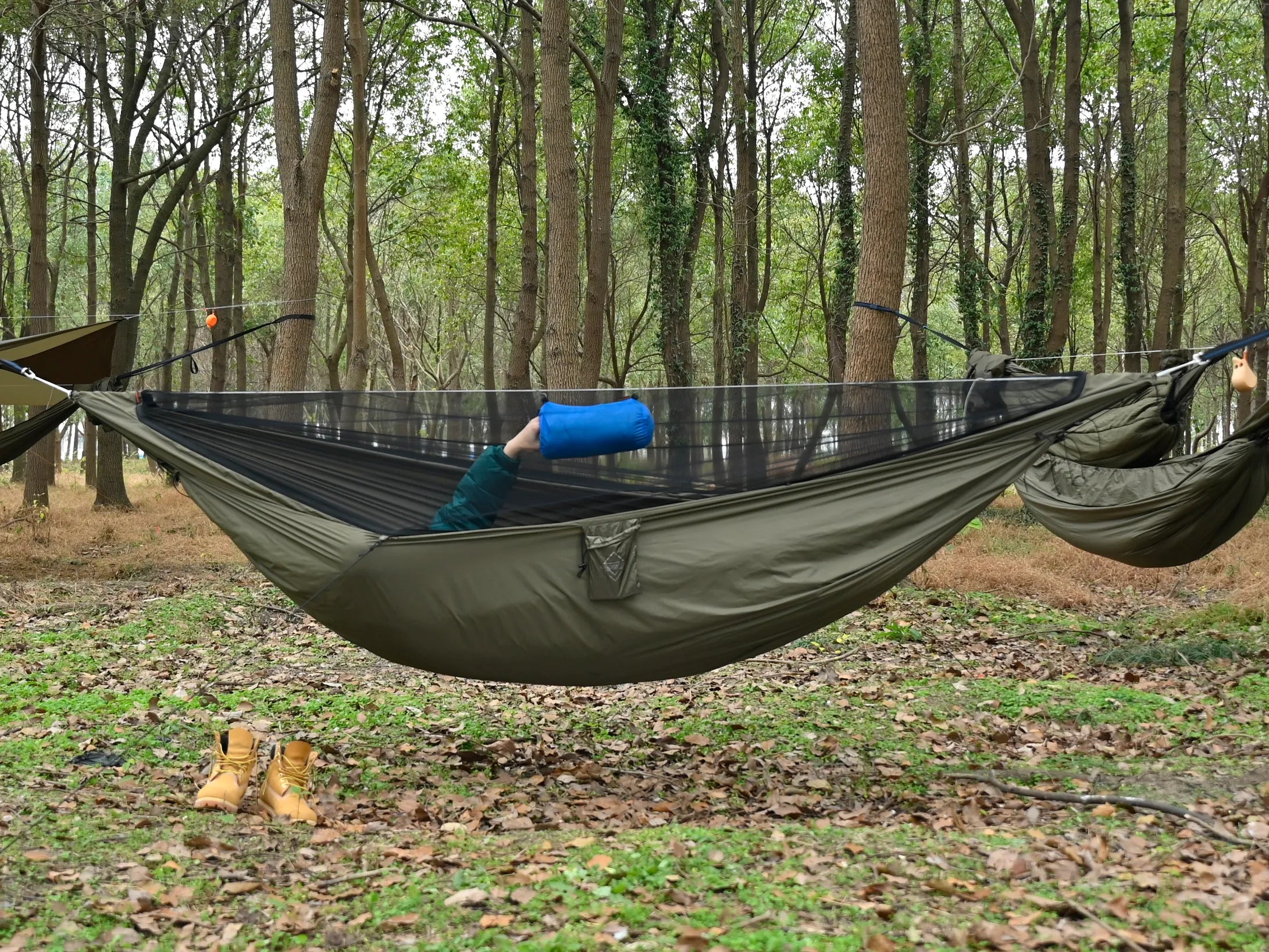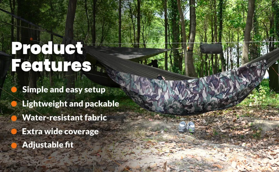 Whether you’re facing snowy flurries or humid dew, this hammock cover for camping keeps moisture out of your underquilt, preserving heat and ensuring a cozy night—even in winter’s bite or summer’s breeze with double-skin protection.