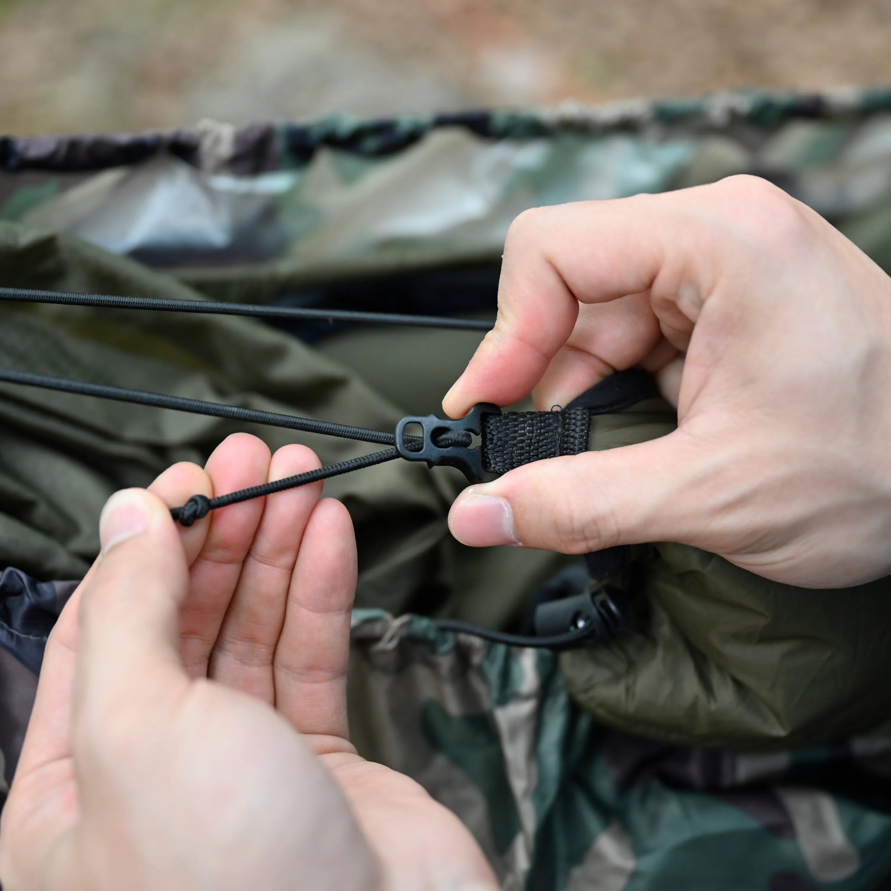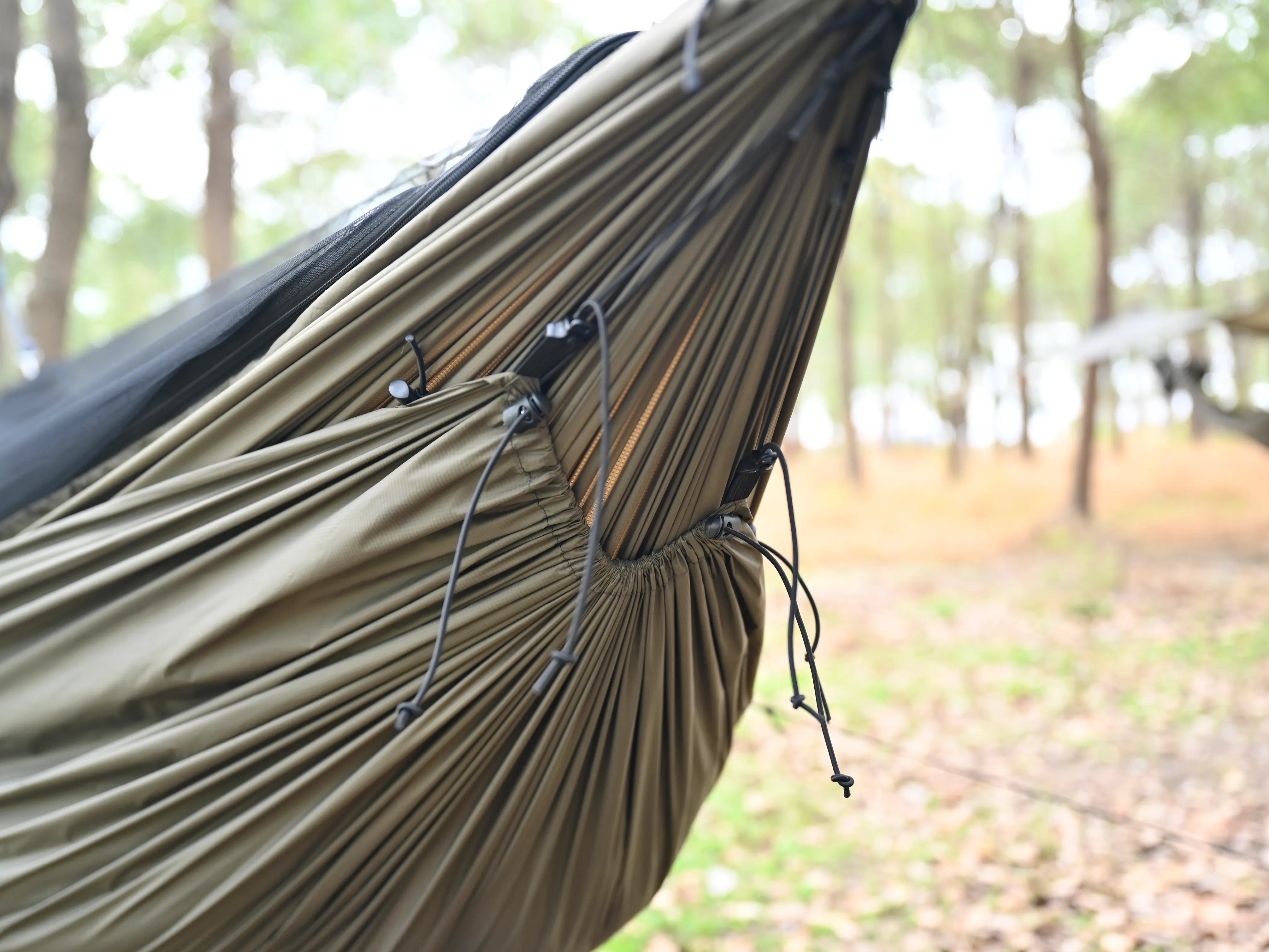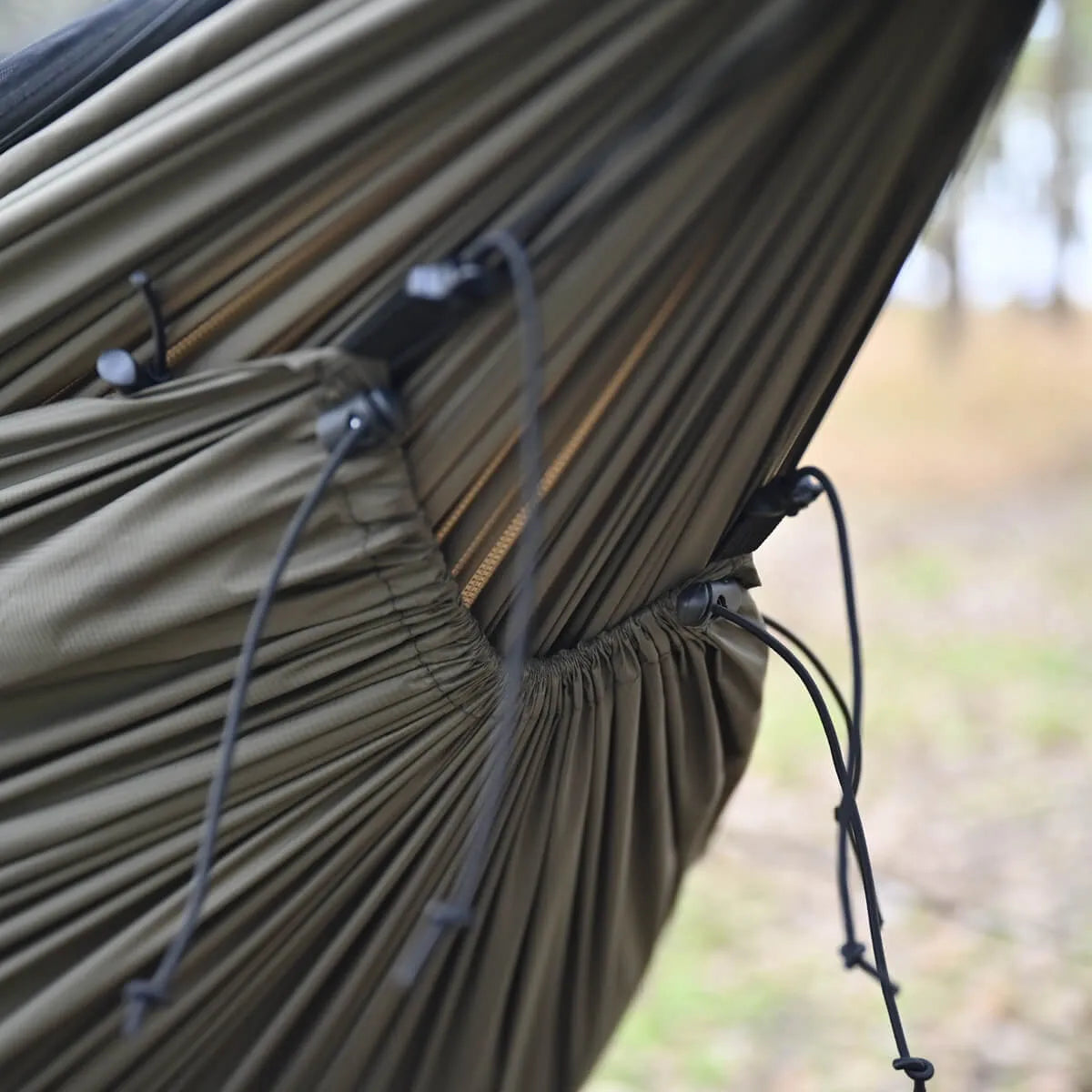 Customize fit effortlessly using adjustable shock cords and line locks. Tighten or loosen for perfect underquilt alignment—no exiting the hammock required.