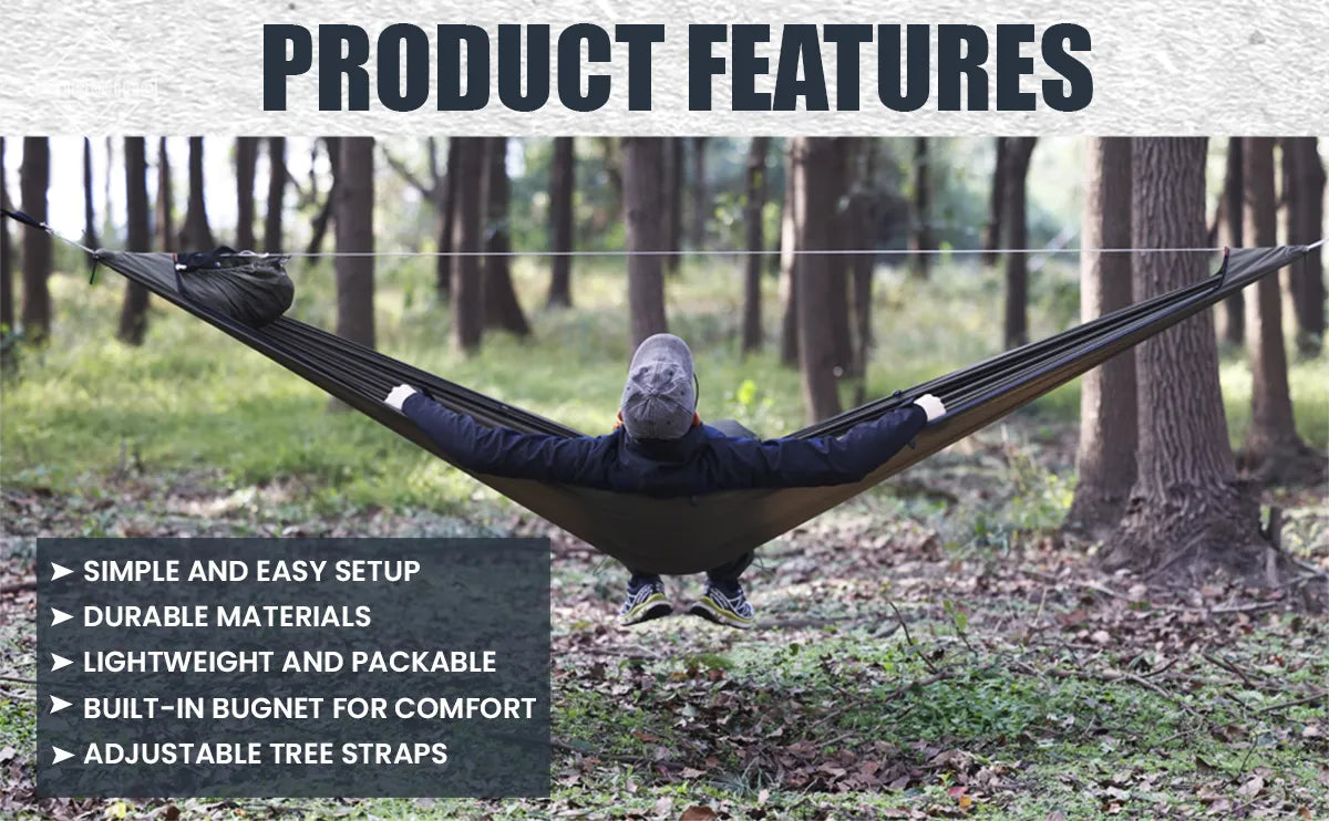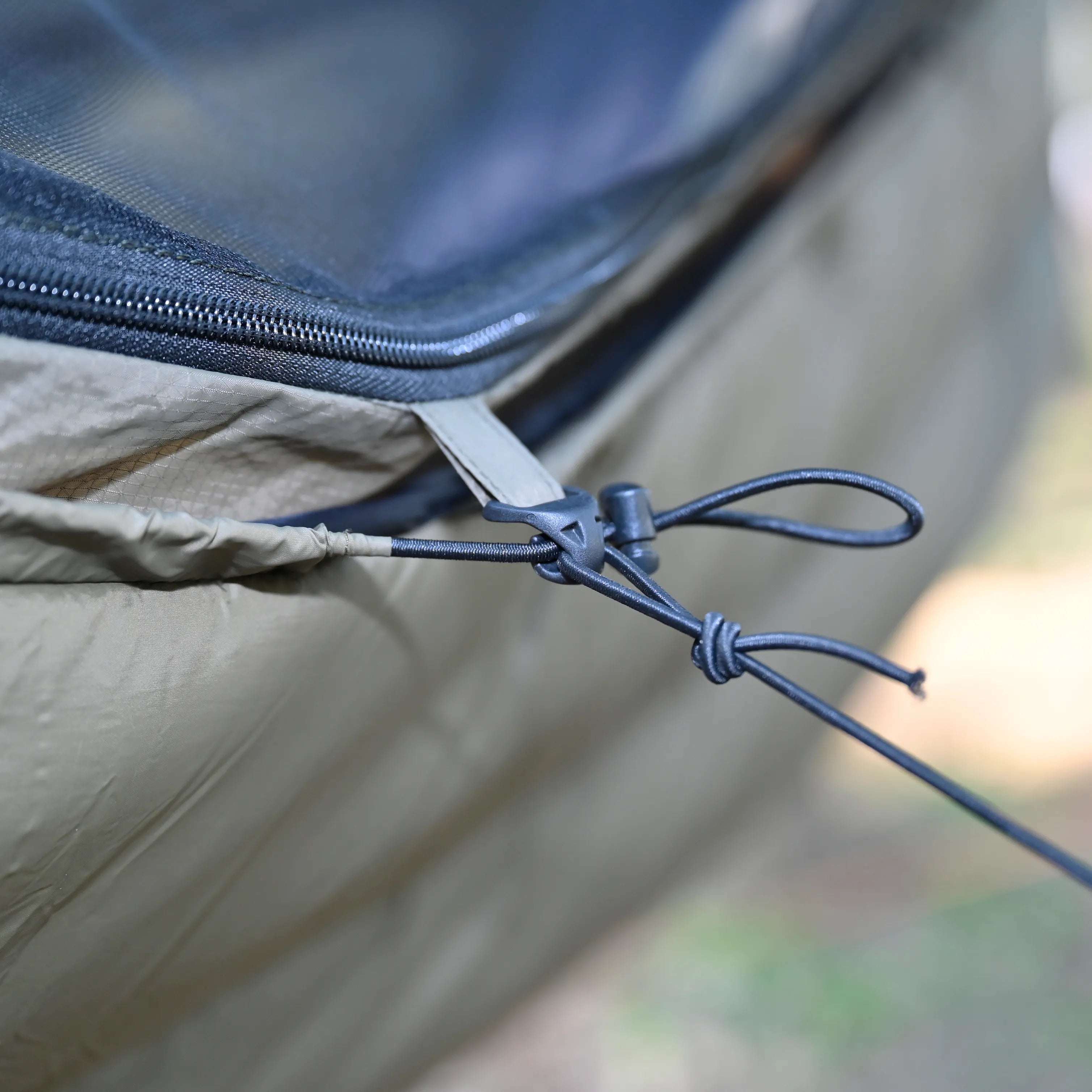 - Integrated No-See-Um Bug Net – Features a full-length, two-way zipper and breathable polyester mesh for 360° insect protection. Easily roll it back for open-air lounging or secure it for bug-free nights—ideal for backpacking hammock camping in mosquito-heavy areas.