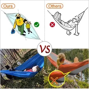 - All-Weather Durability & Comfort – Built with 40D/70D ripstop nylon (500-lb capacity) and a seamless, stitch-free design, this hammock ensures a flat, banana-free diagonal lay. Perfect for 4-season camping, whether in humid jungles or chilly forests.