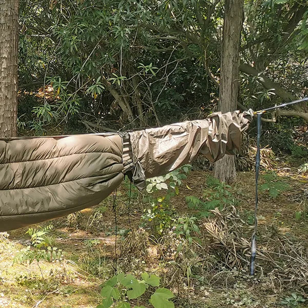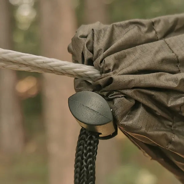 Slide your hammock + underquilt + topquilt into the sleeve in seconds. No wrestling with knots—just zip, cinch, and go. Even works mid-air on tree straps!