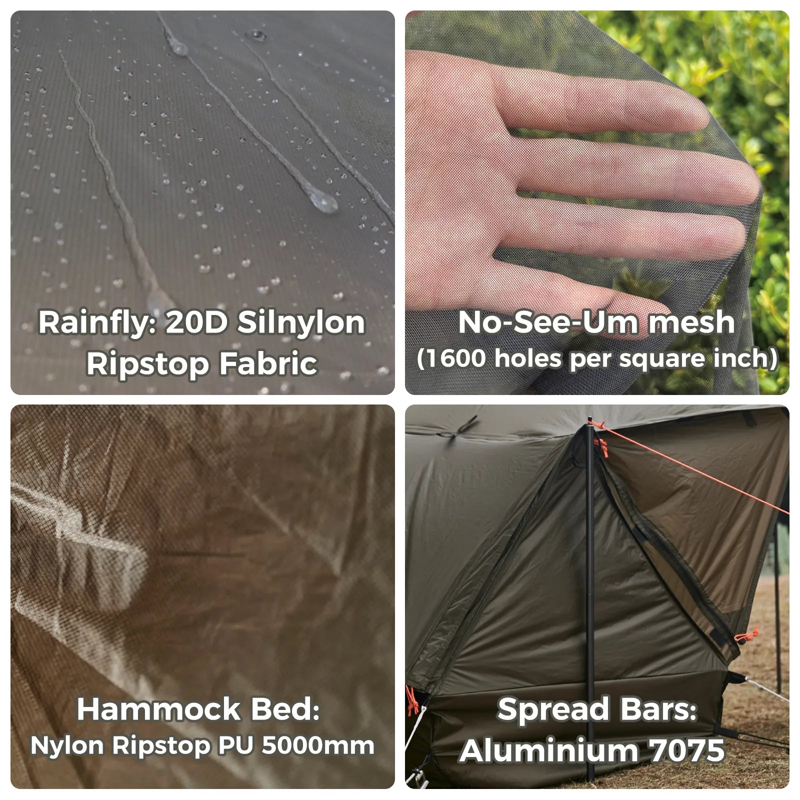 - Durable Materials + Complete Kit– 20D silnylon ripstop tarp, PU 5000mm nylon ripstop bed, No-See-Um mesh (1600 holes/in²), and 7075 aluminum spreader bars. Includes suspension system (based on selected version), stakes, guylines, and stuff sacks. Packed size 17.7" × 7.1".