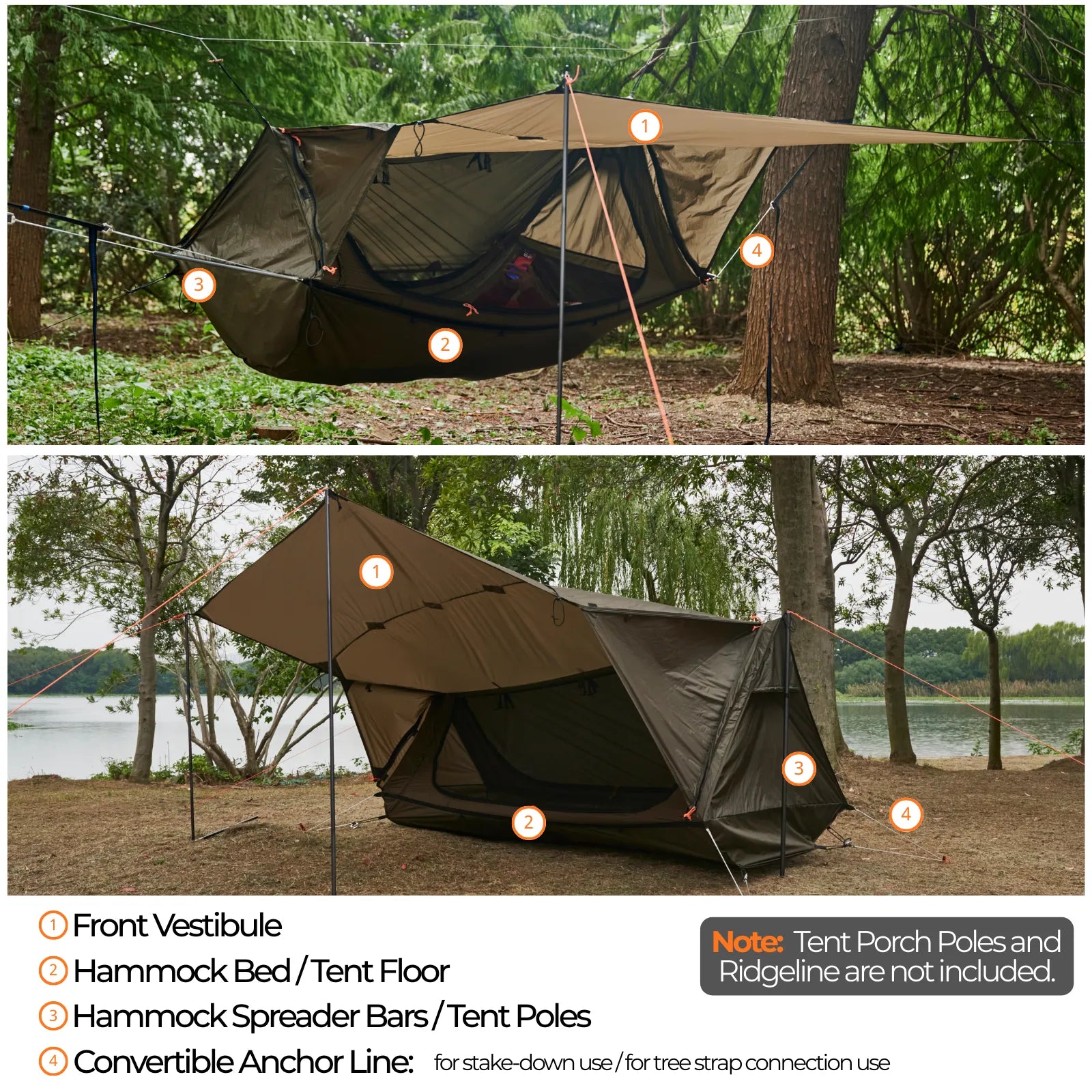 - Smart 2-in-1, multi-use parts: No extra tent poles or trekking poles needed. The aluminum bars work as spreader bars in hammock mode, then rotate to become the head and foot poles in tent mode—one set of parts, two complete builds.