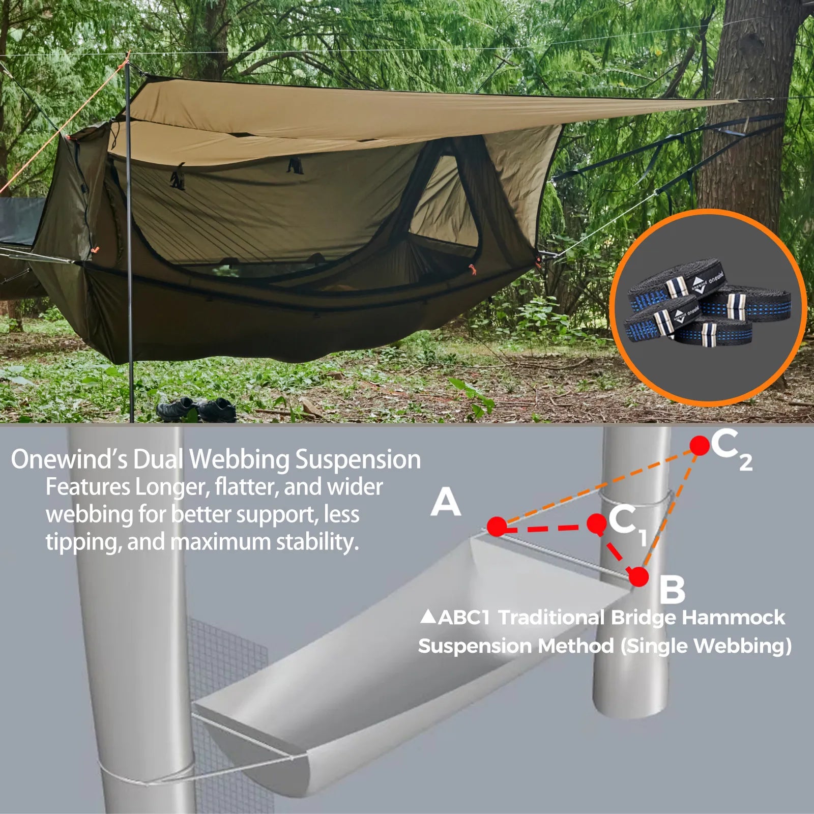 Designed for the minimalist adventurer and larger-framed campers, this system swaps bulk for performance. Using high-tech UHMWPE ultralight webbing, Whoopie Slings, and Evohooks, it slashes the suspension weight from 750g to just 148g.