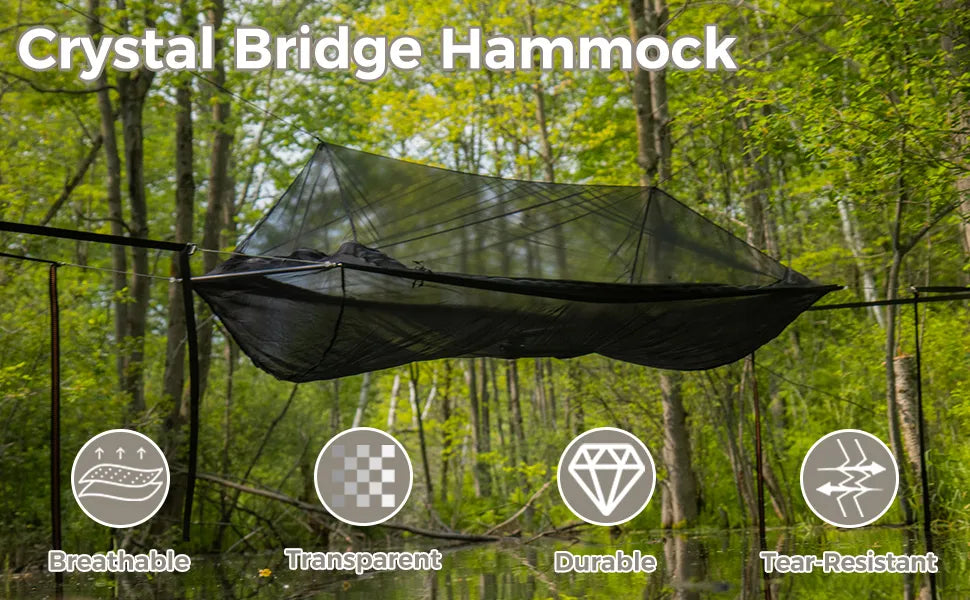 😫SICK OF WRESTLING WITH UNCOMFORTABLE HAMMOCKS?Meet Onewind® Crystal Bridge Hammock – The World's First Semi-Transparent Bridge System That Delivers True Flat-Lay ComfortWhile Weighing As Light As 2.6 lbs (1.2kg)!