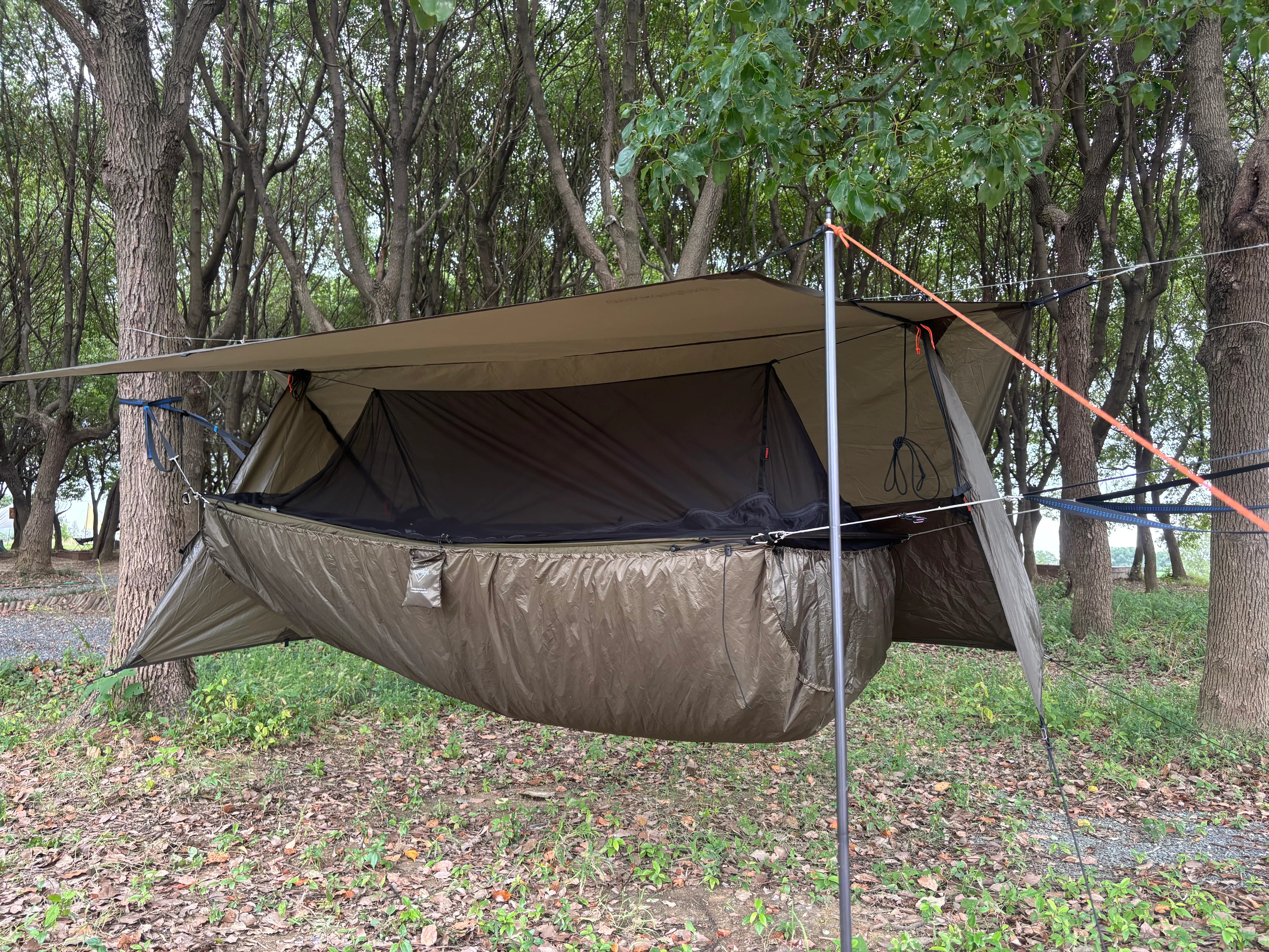 รวมกับ Crystal Bridge Hammock และ ผ้าใบ เพื่อระบบการนอนหลับที่สมบูรณ์—ป้องกัน, เสถียร, และสะดวกสบายในสภาพอากาศกลางแจ้ง.
